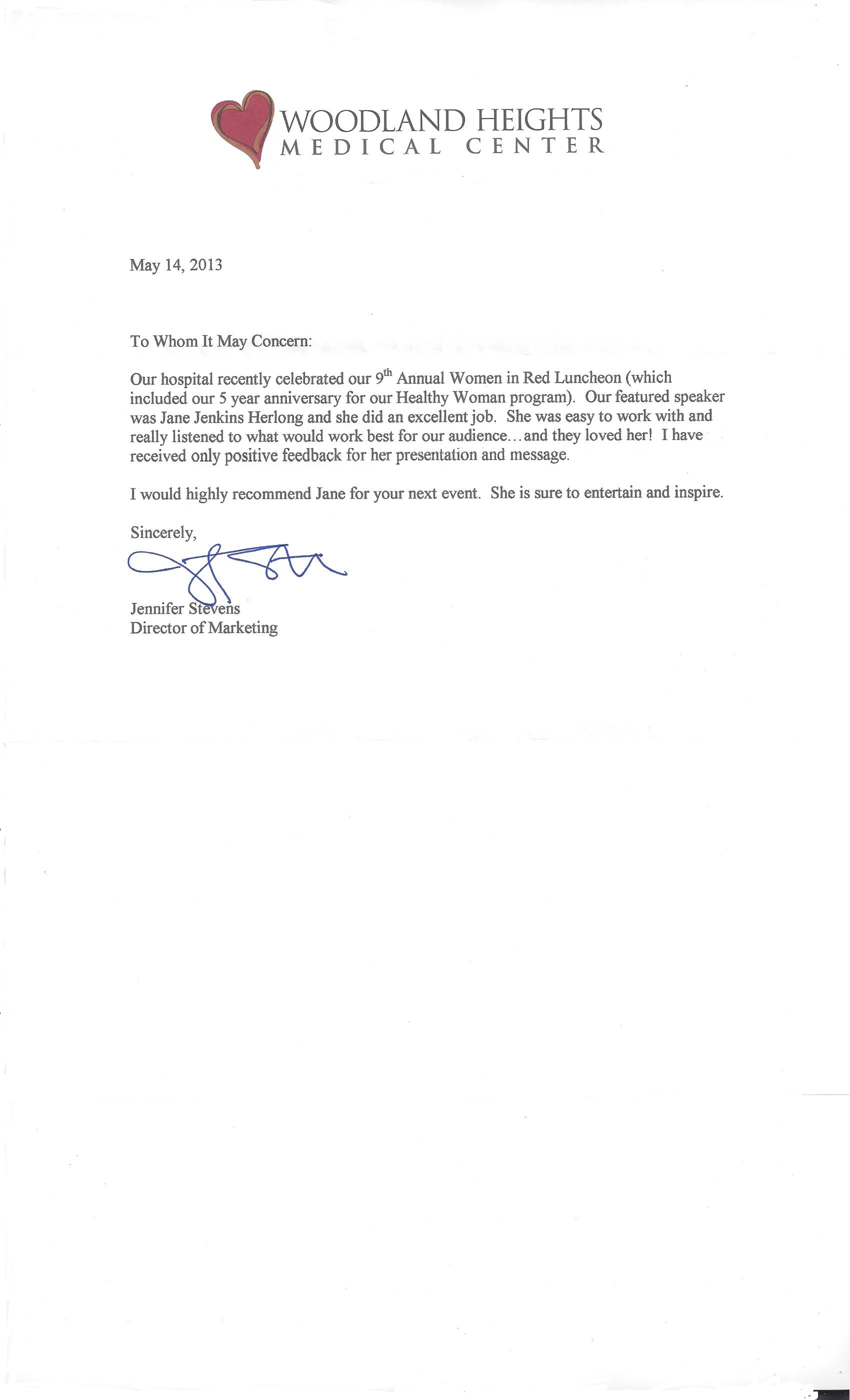 Verified @gmail.comThank you so much for serving as our keynote speaker for the 14th annual Women's Health Event hosted by the Scotland Memorial Foundation. Jane's level of professionalism and expertise resonated with the 200 women in attendance. The laughter, empowerment, and good ole' southern singing in Jane's presentation left the women feeling they could conquer the world by being true to who they are, taking charge of their health while learning, laughing and loving more. As one participant reported "She was great. Just goes to show you can do anything you want to no matter where you come from" It was a pleasure to have Jane join us and meet our community. Book her for your next event you won't be disappointed. Additional Participant Feedback: "Laughter is good for the soul. Keynote speaker Jane J. Herlong was very inspiring a cheerful heart is good medicine" "She was very inspiring" "Jane was great and very inspiring" "Jane encouraged me to live with more humor and to keep moving to better health accomplishments"