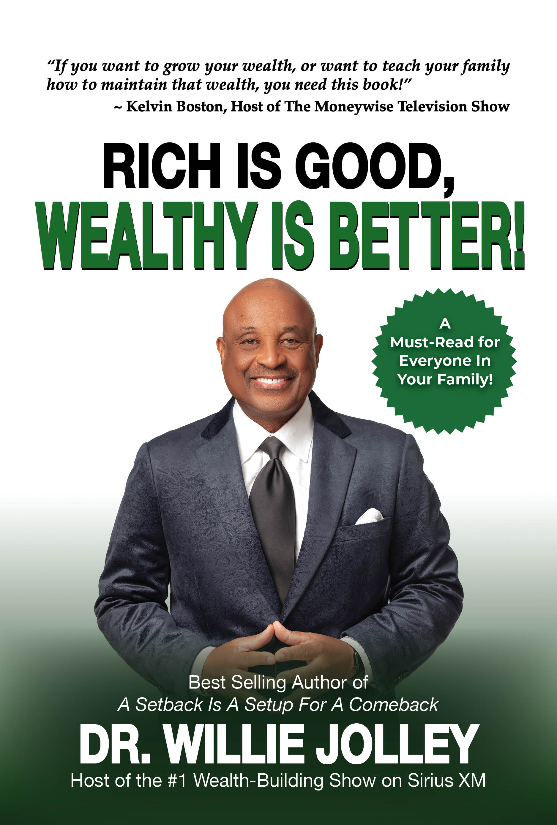 Dr. Jolley is the author of several international best-selling books including, It Only Takes A Minute To Change Your Life, A Setback Is A Setup For A Comeback, Turn Setbacks Into Greenbacks and An Attitude of Excellence (which was endorsed by former Ford Motors CEO, Alan Mulally and Dr. Stephen Covey, author of the landmark book, The 7 Habits of Highly Effective People). He is also a contributing author of Chicken Soup for The Christian Soul, where he featured on the front cover with Joyce Meyer, Dr. Tony Campolo and Naomi Rhode. Dr. Jolley is also the co-author of the popular marriage book, Make Love, Make Money, Make It Last!, with his wife Dee. His latest book, entitled Rich Is Good, Wealthy Is Better!, focuses on the powerful lessons he has learned over the last twenty years interviewing billionaires and millionaires on his Sirius XM Show.