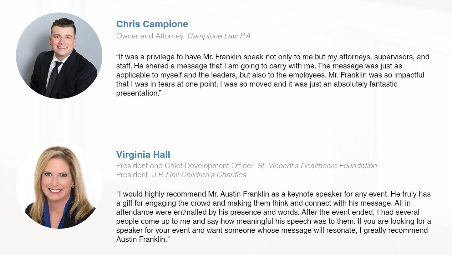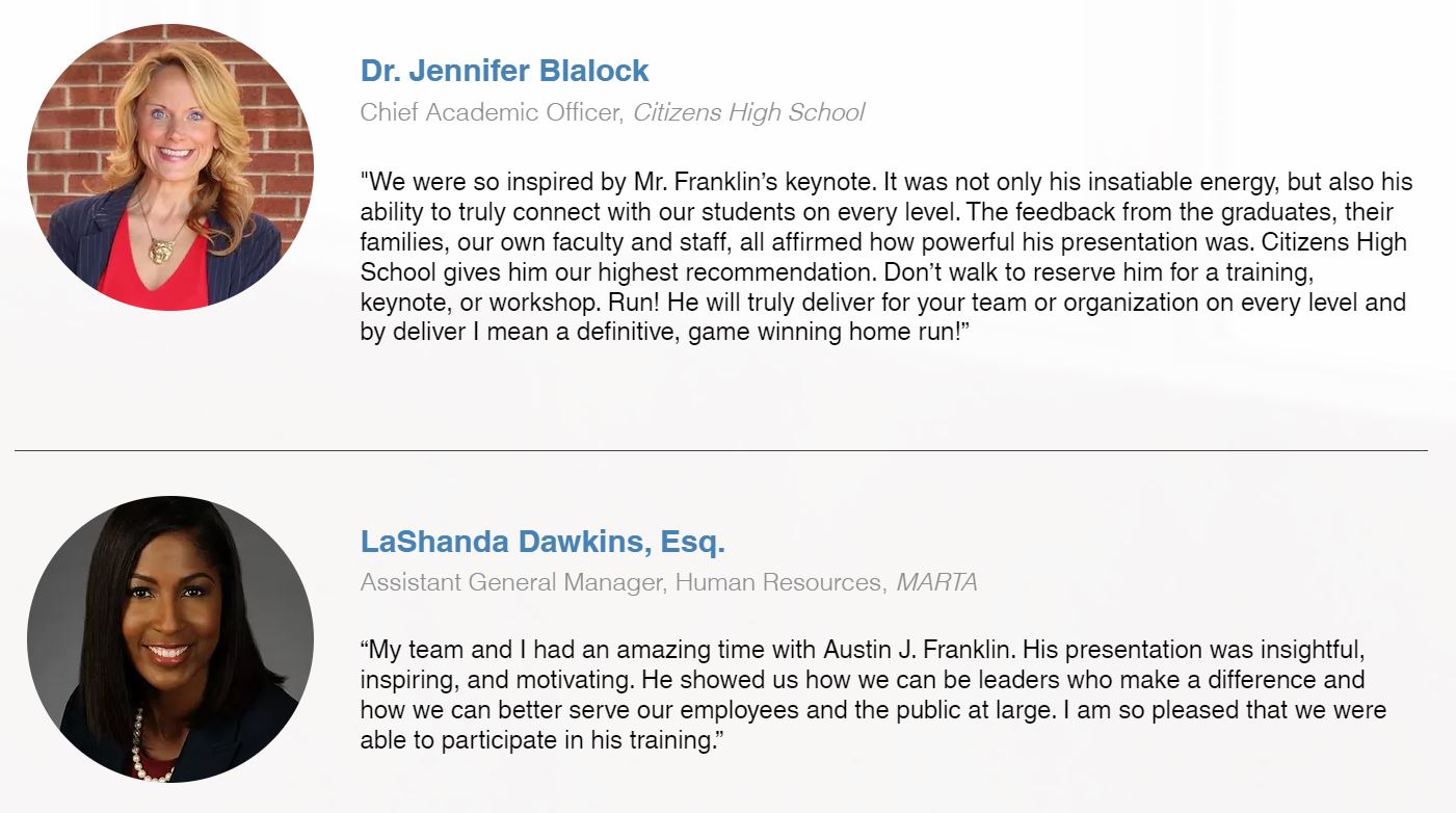 In booking Austin J. Franklin as a keynote speaker, organizations can expect more than just a presentation; they can anticipate a transformative experience. His keynotes inspire positive cultural shifts, promote strategic thinking, and deliver tangible results, making him a sought-after voice for those aiming to elevate leadership, foster innovation, and drive sustained success.