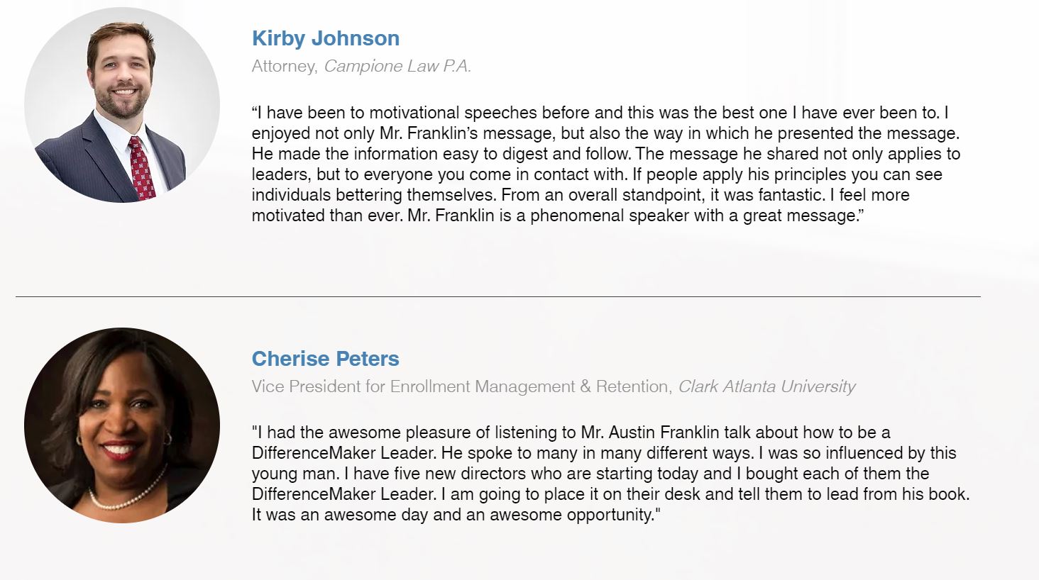 Austin J. Franklin has served as a three-time commencement speaker, named one of Florida Black Expo's Top 20 Under 40, and was named as a "Leader Under 40 Changing Lives" as a Community Pearls Award recipient. Franklin is a member of Alpha Phi Alpha Fraternity, Leadership Jacksonville - Next Generation, and he currently serves as an Advisory Board Member for the Johnson Family YMCA and AMIKids in Clay County, Florida.
