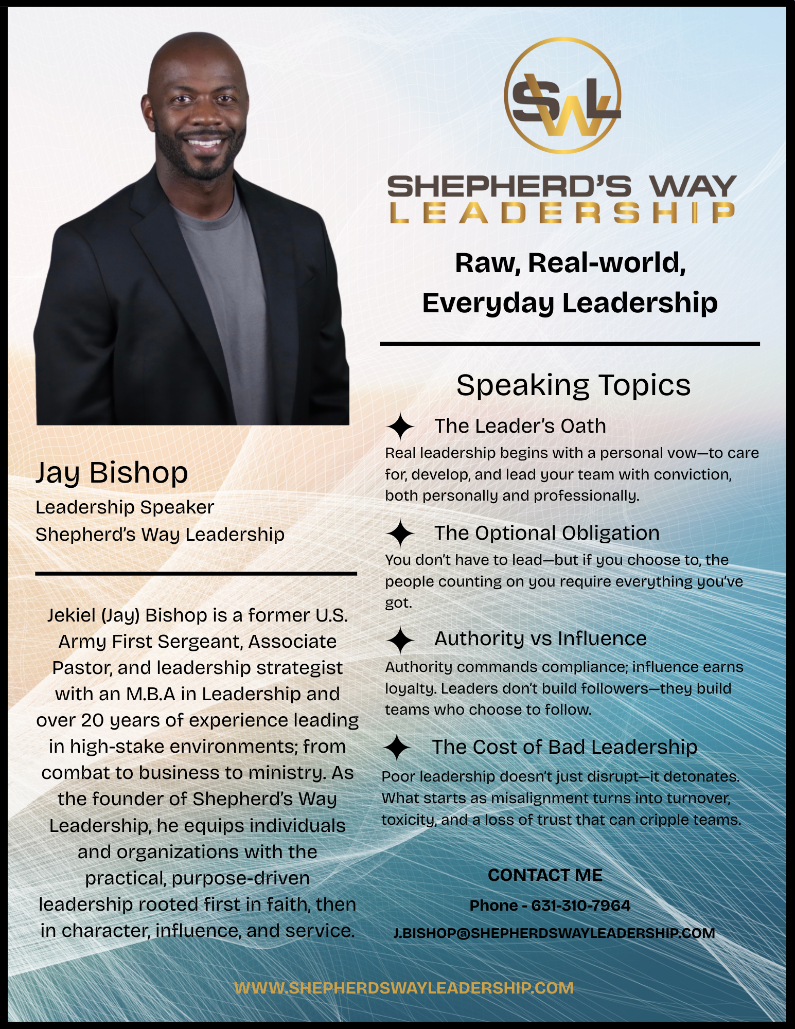When organizations need leaders who are ready to take ownership, stop making excuses, and lead with integrity, Jay Bishop delivers. His signature programs, The Optional Obligation and The Leader’s Oath, cut through academic fluff and challenge audiences to embrace leadership as a choice that demands responsibility, character, and influence.