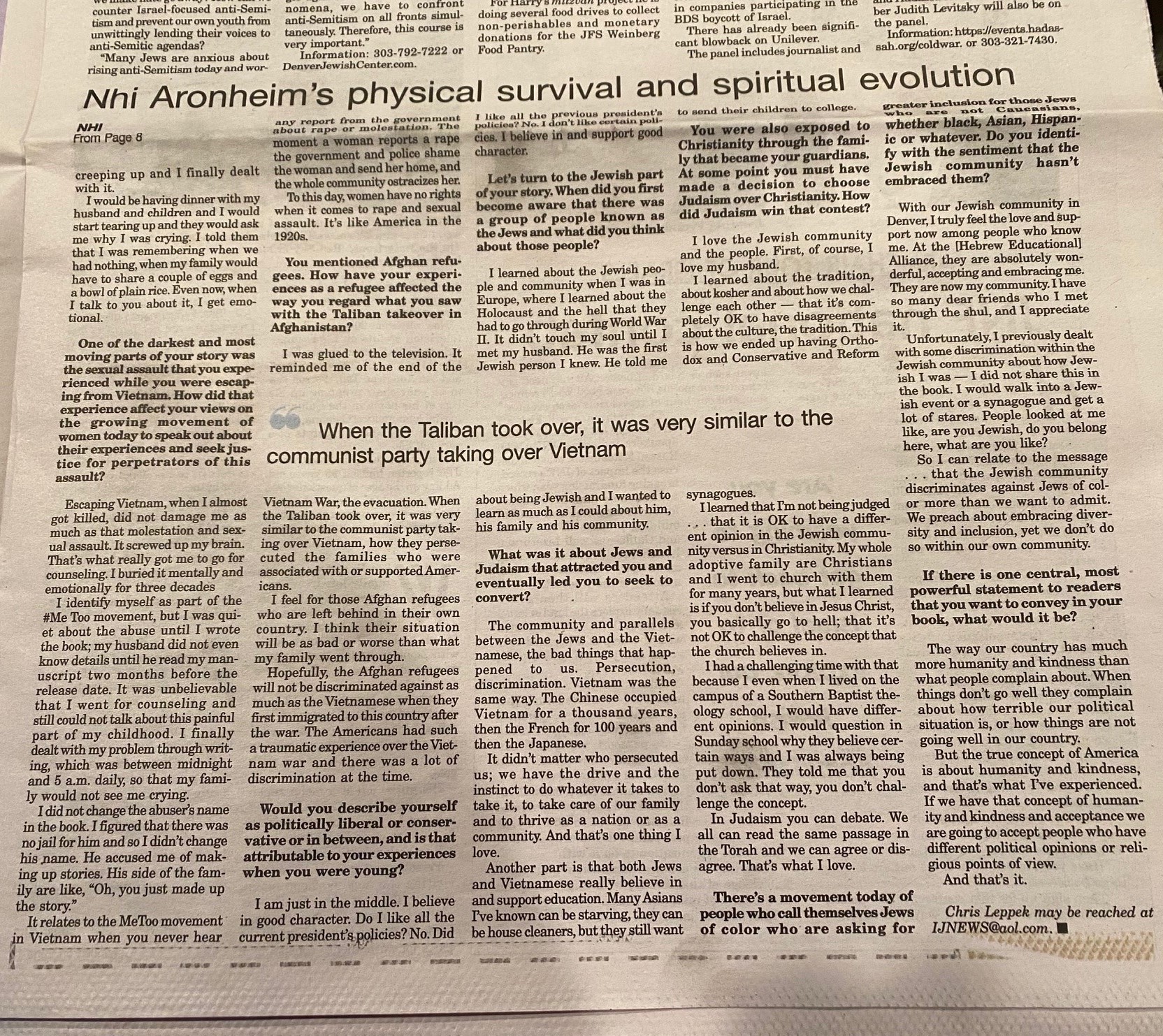 As someone who has lived through war, displacement, and cultural adaptation, Nhi deeply understands what it means to face adversity, rebuild from nothing, and thrive across identities. Her story has been featured in Colorado Public Radio (CPR), Harvey Brownstone Interviews, Jewish News, Westword Newspaper, and several anthologies, including Kentucky Women: Two Centuries of Indomitable Spirit and Vision.