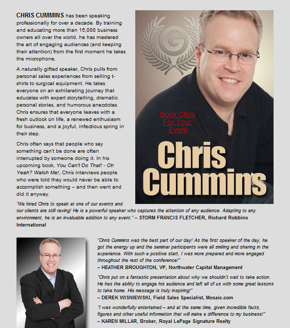 I just wanted to let you know what an outstanding job Chris did at our sales meetings last week. Everyone loved his presentation and came away with some excellent advice on how to get their accounts to buy more!! He definitely did his homework and was familiar not only with our company but our whole industry. After Deane met him for the first time on Tuesday morning, he came over and asked me “Are you sure we didn’t meet Chris before?” His warm personality put everyone at ease from the minute he started speaking. He passed along valuable tools that our team will be able to incorporate into their regular sales calls and found a way to put their hefty targets into perspective so they no longer loom as large. Thanks for all your help! Debora Debora Holm Preferred Nutrition 153 Perth Street Acton, ON L7J 1C9 dholm@pno.ca (888) 826 9625 x 101